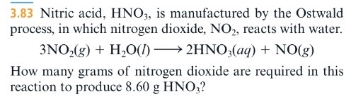 1 mol NO2 3 mol NO2 1 mol H2 O 3 mol H2O. Compound amount NO2 75 g H0 1699 g HNO3.